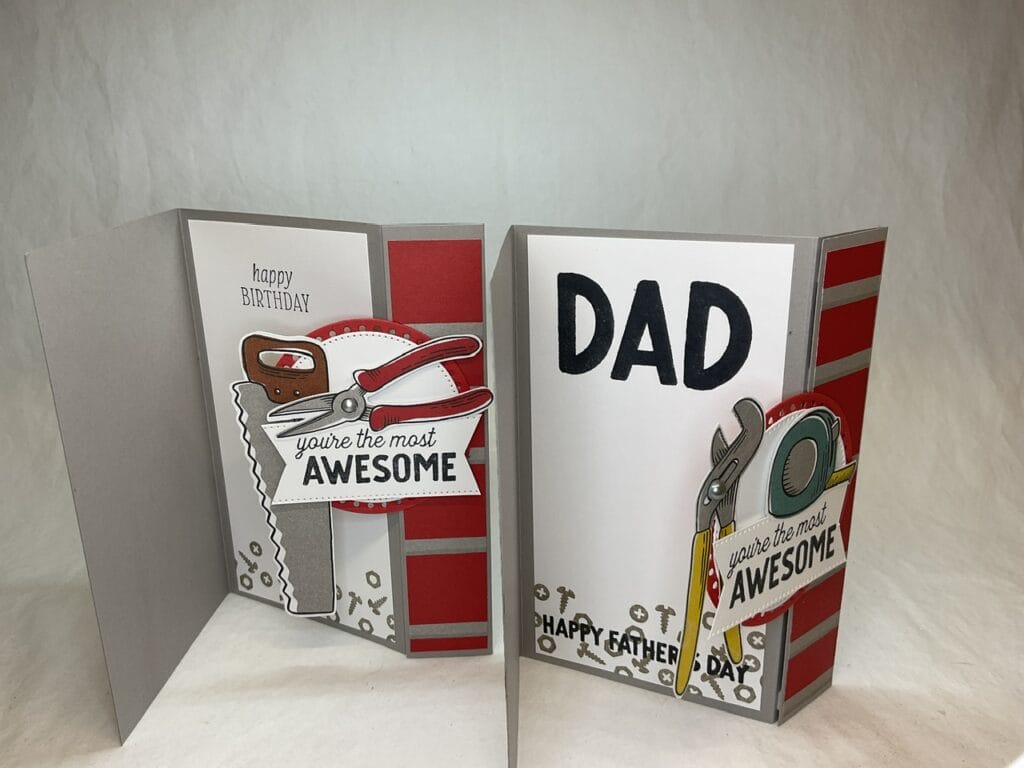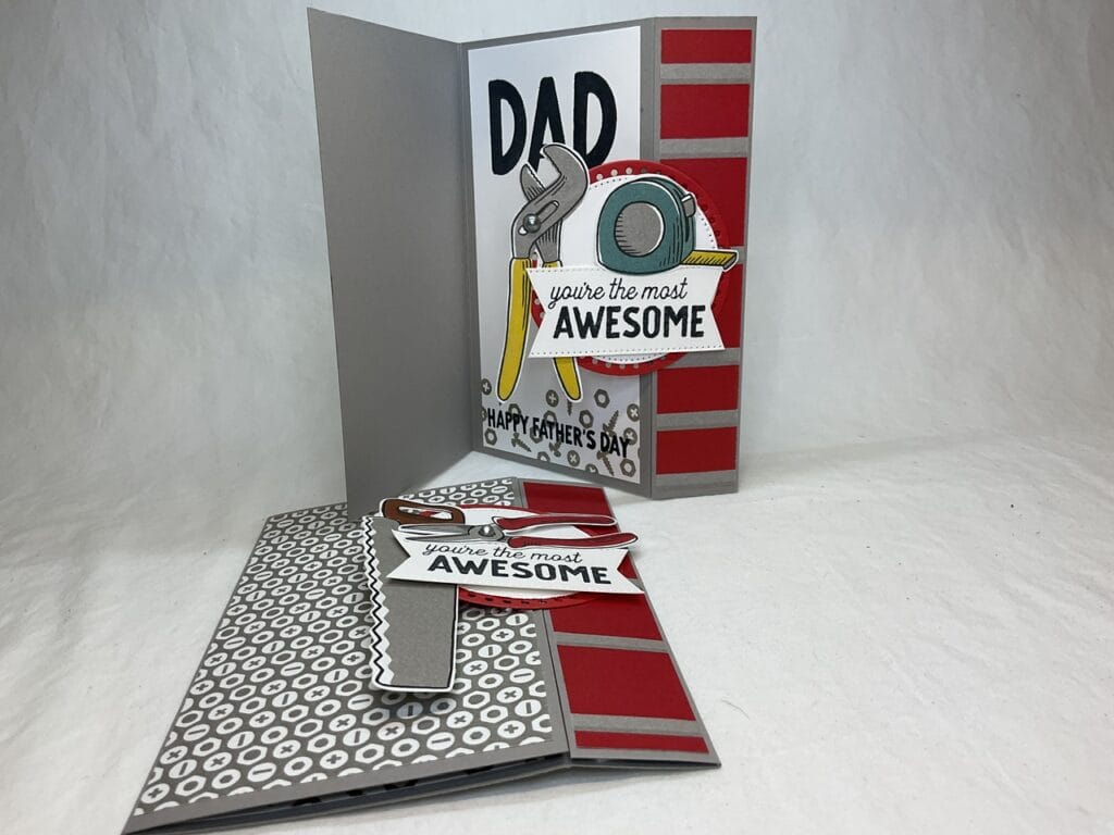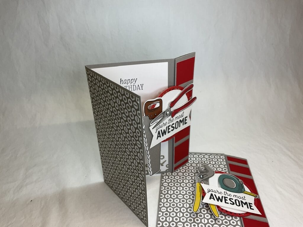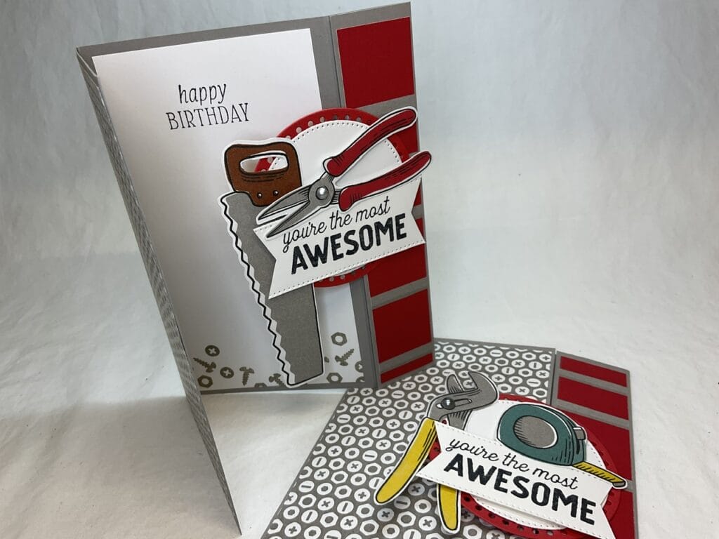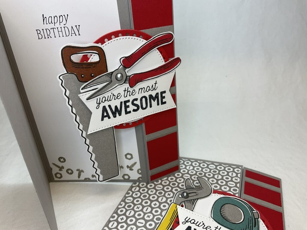 I have been waiting and waiting to dive in and have fun with this bundle! These projects use the SAB(sale a bration) coordinating with this bundle… it’s so fun! The next project will use just the bundle and coloring with the blends. AND there are dies in this bundle to make tools with dies. Imagine the tools die cut and using foil paper for the metallic tool parts! This card features a ‘new to me’ fun fold. The fold works perfectly with this card. The DSP is bright and colorful, the focal point is bold and just a few pieces, it goes together easily… a recipe for the perfect card!