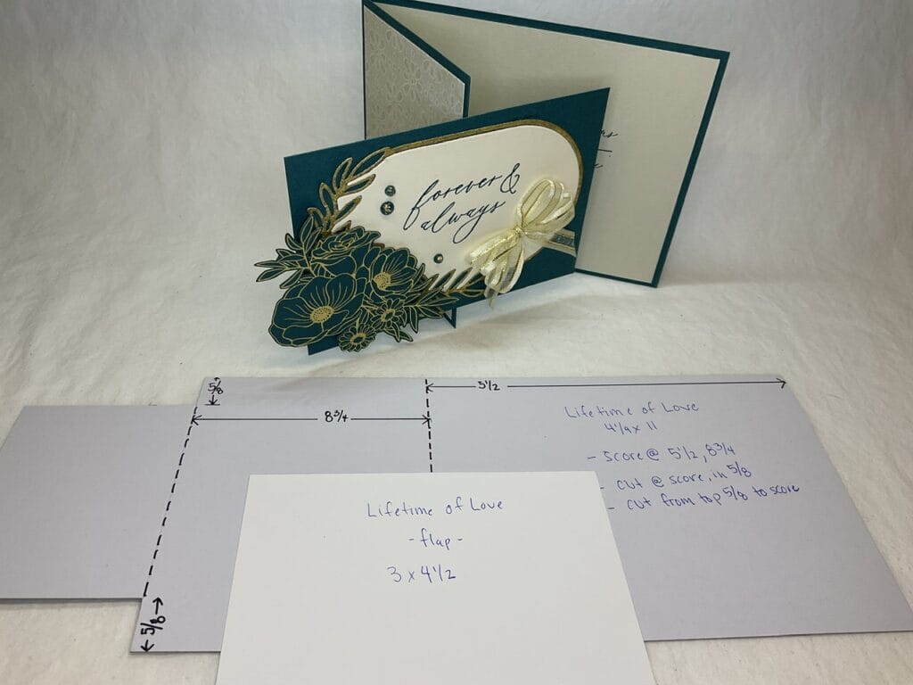 Base 4 1/4 x 11, score at 5 1/2, 8 3/4, see template in photo to cut corner notches at 5/8 inch
