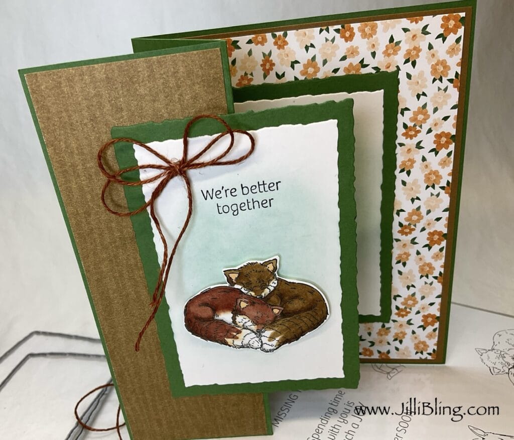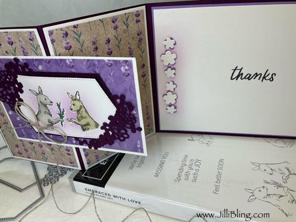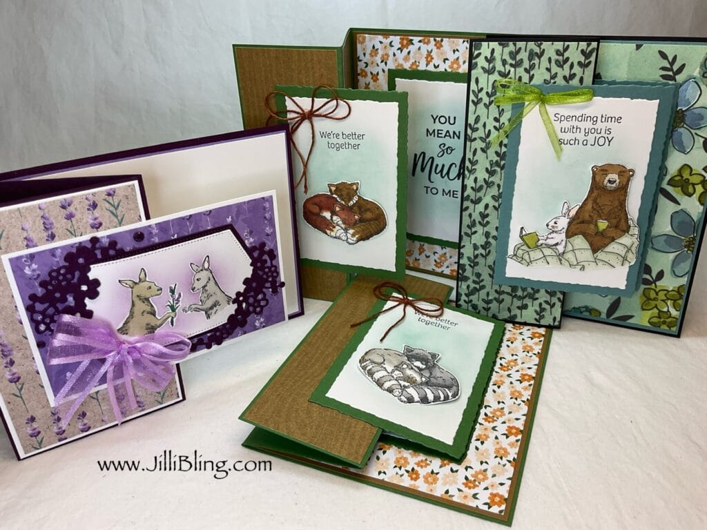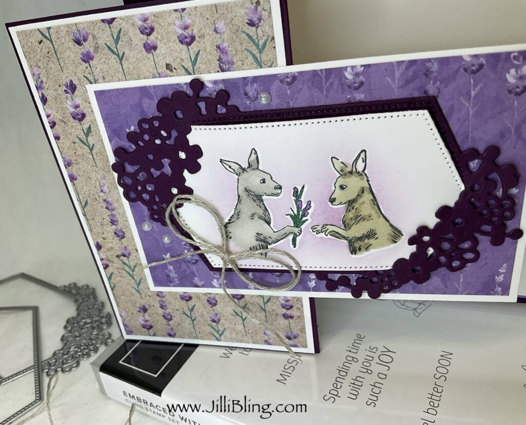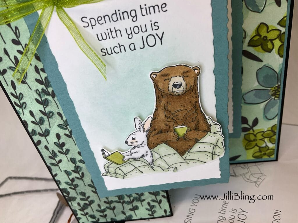 I love this stamp set. The images are adorable and the words are very nice. The kangaroo image shows them sharing what I think is lavender. Their facial expressions are so sweet. The foxes (or I imagined them as raccoons) are snuggled up together. Their outline together looks like a heart… ahhhhh. ❤️❤️❤️. Then there is the bunny and bear reading a book and drinking tea (coffee) under a blanket. They are both so happy, relaxed and content.