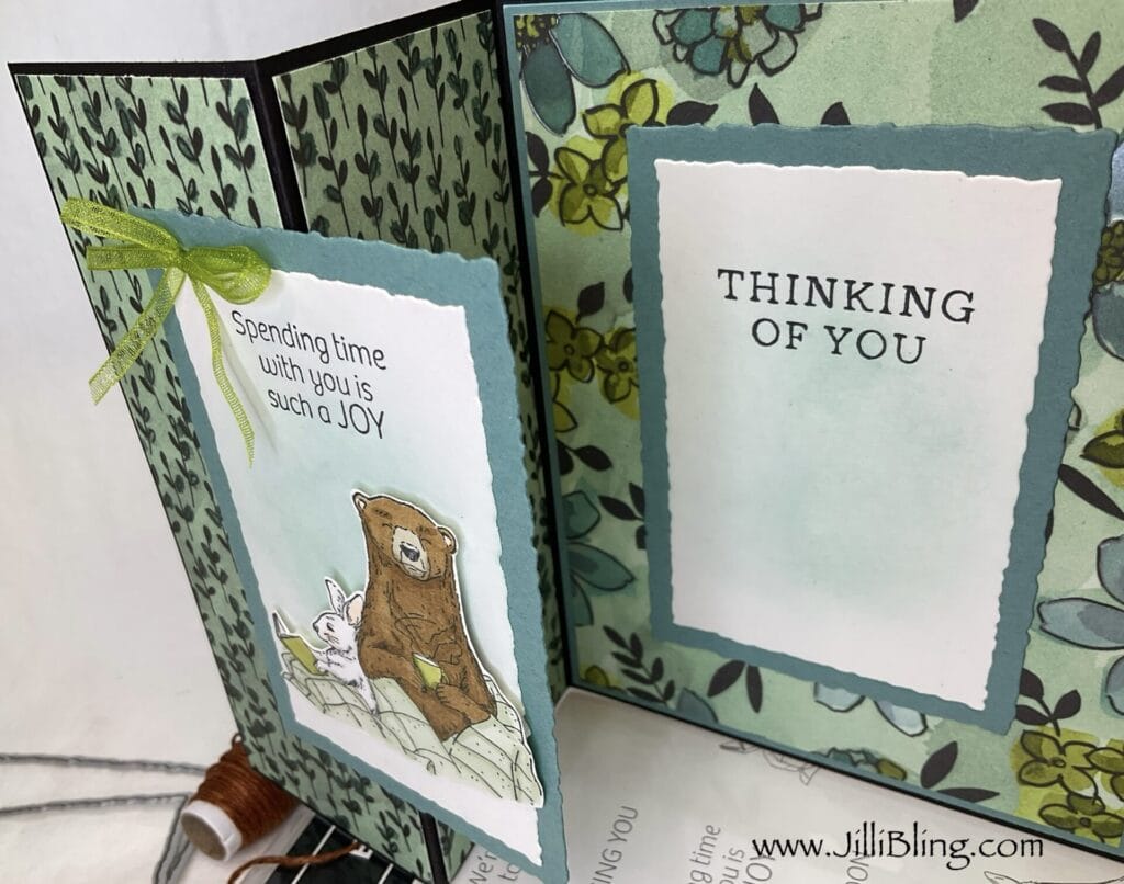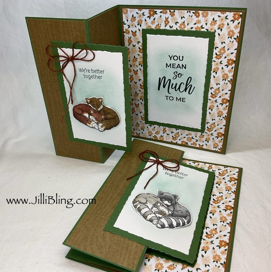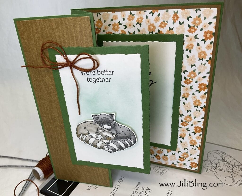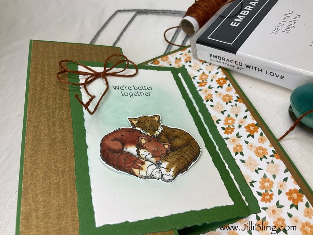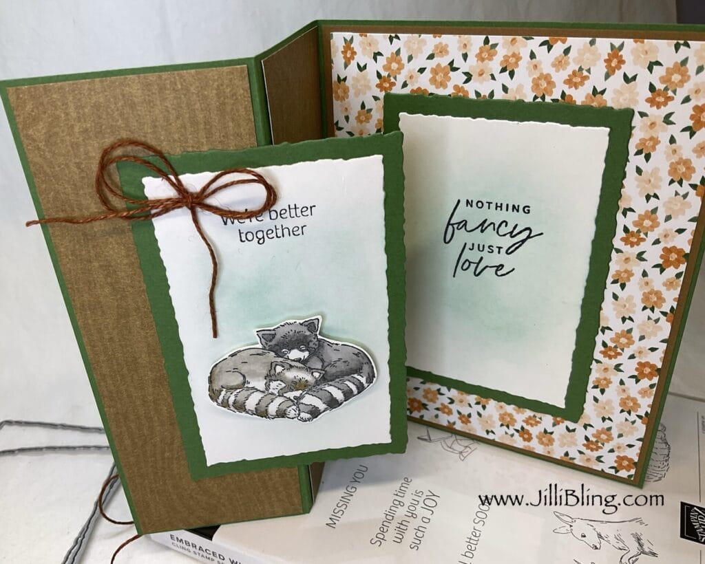 I love this stamp set. The images are adorable and the words are very nice. The kangaroo image shows them sharing what I think is lavender. Their facial expressions are so sweet. The foxes (or I imagined them as raccoons) are snuggled up together. Their outline together looks like a heart… ahhhhh. ❤️❤️❤️. Then there is the bunny and bear reading a book and drinking tea (coffee) under a blanket. They are both so happy, relaxed and content.
