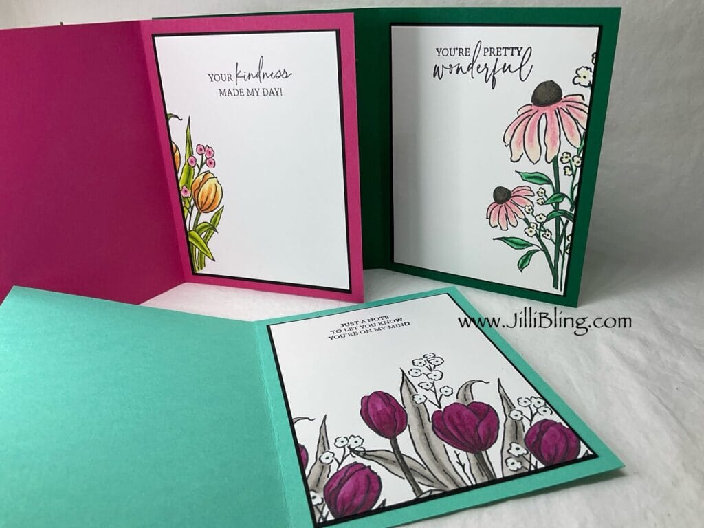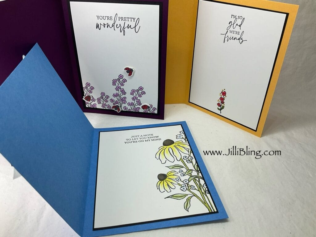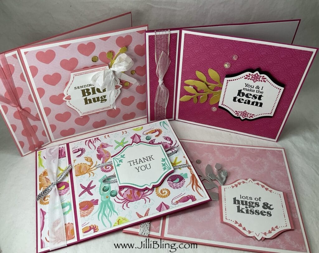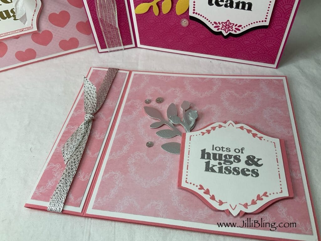 Bundles mean we save 10%! Hugs for Love is an adorable stamp set that perfectly pairs with the To The Point punch. You get a discount when you buy them together. Bright Borders is a second stamp set that has great images including stamps that perfectly fit the same punch. I say get it all! These cards use the two sets and punch. Which is your favorite?