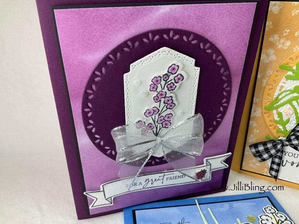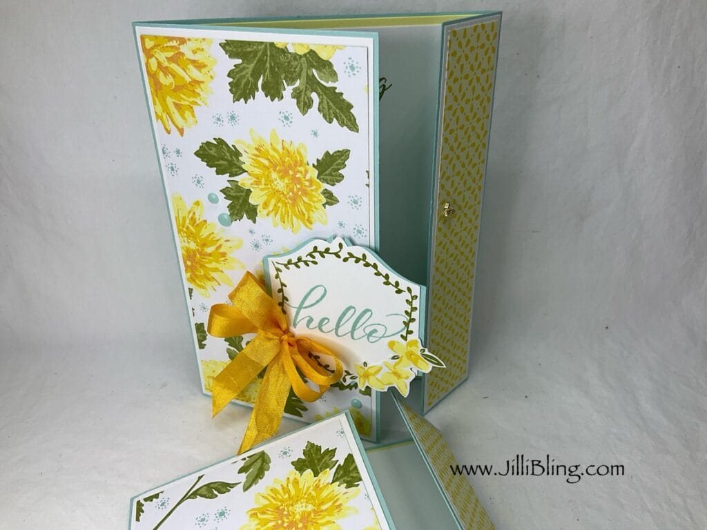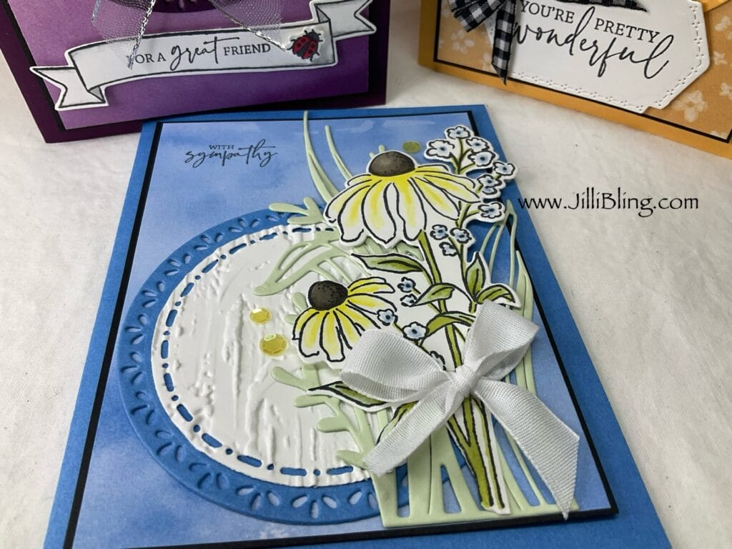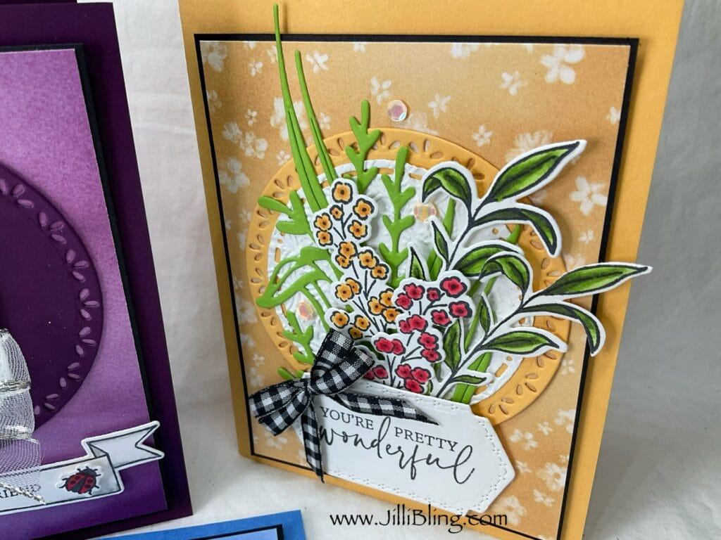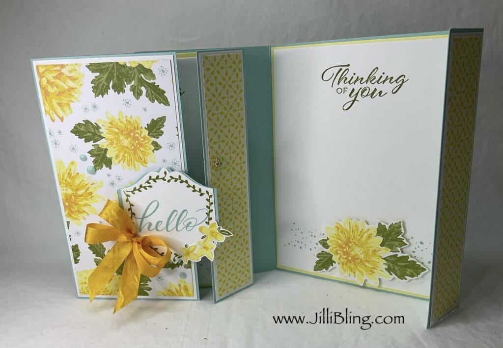 I wish for spring… this card feels like spring. That tiny bee is the icing on the cake! This Floral Delight DSP is so pretty and fresh… I love blue and yellow together! The Bright Borders stamp set perfectly coordinates with the punch To The Point. Making a card is easy with the punch and any beautiful DSP. What do you think?