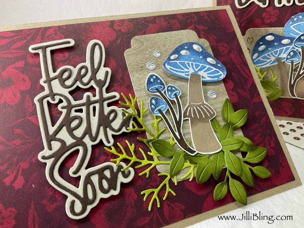 Terrific Toadstools Bundle (stamp set and punch) has my attention! Initial I thought it’s cute and felt no particular draw toward it. The next day I remembered how much our mail girl LOVES mushrooms, Emma’s framed wall poster identifying mushroom species, Evan going mushroom hunting and finally seeing the kids shower curtain featuring mushrooms. Ok, I bought it! Ok… it’s sooo fun. The blue mushroom idea came from my color wheel and I LOVE it.