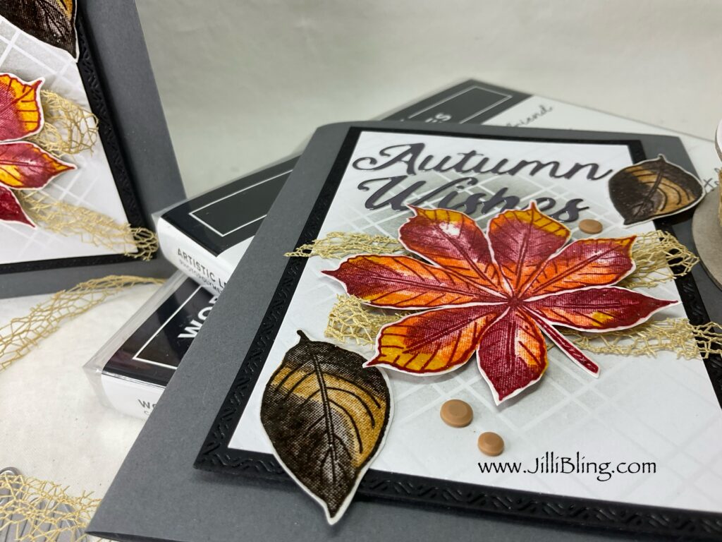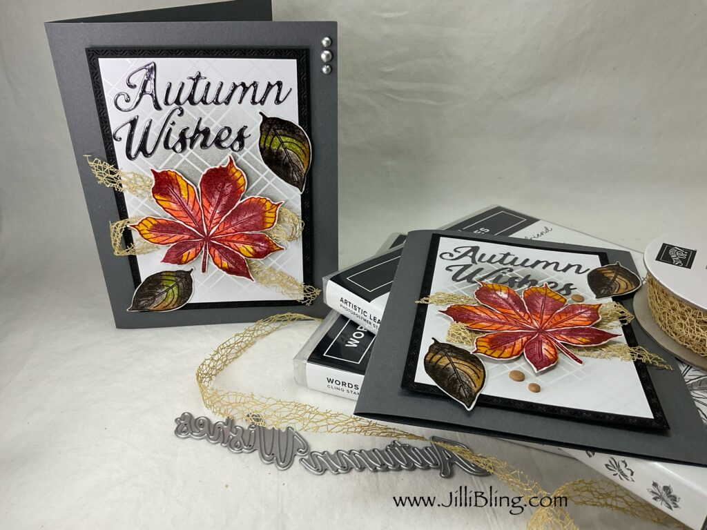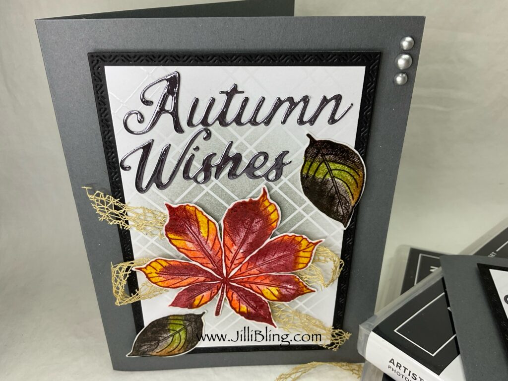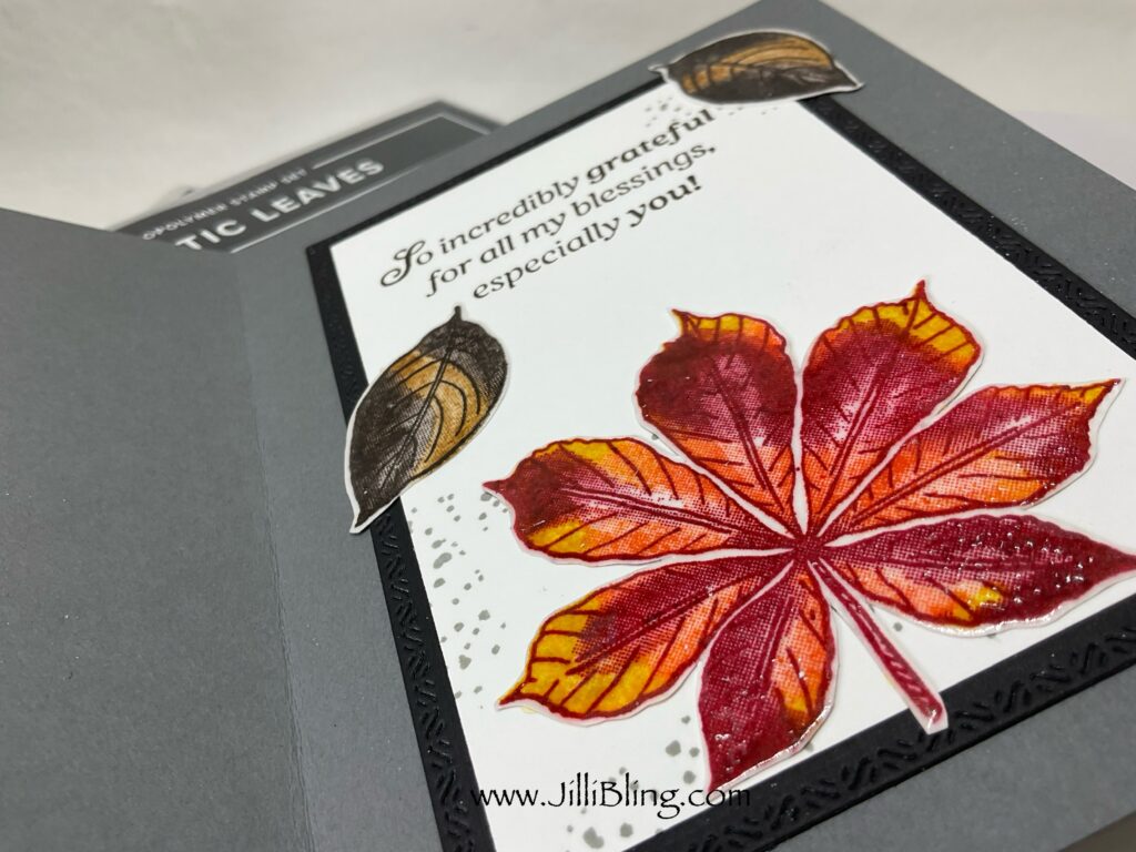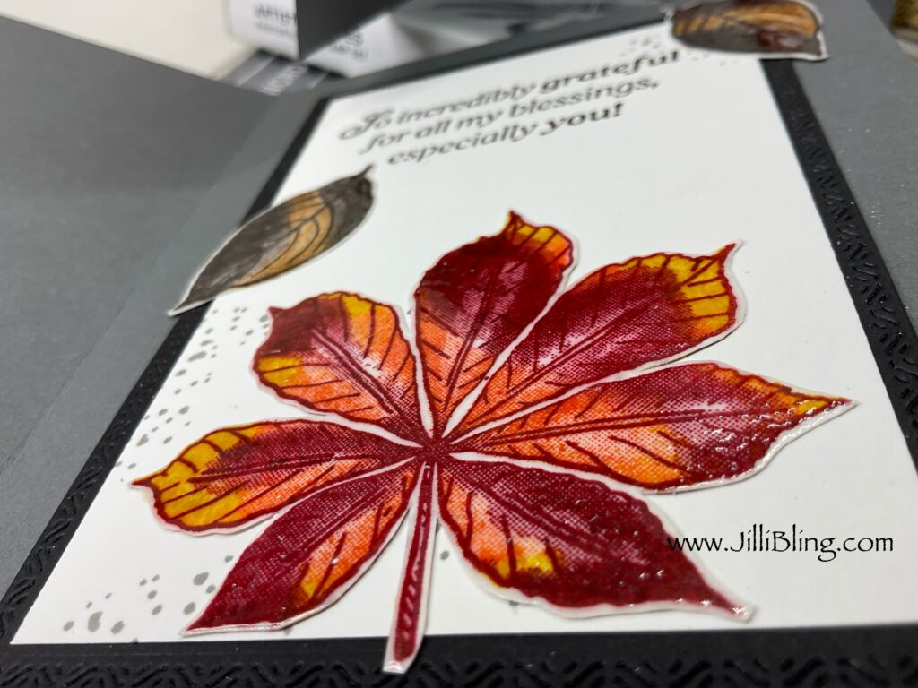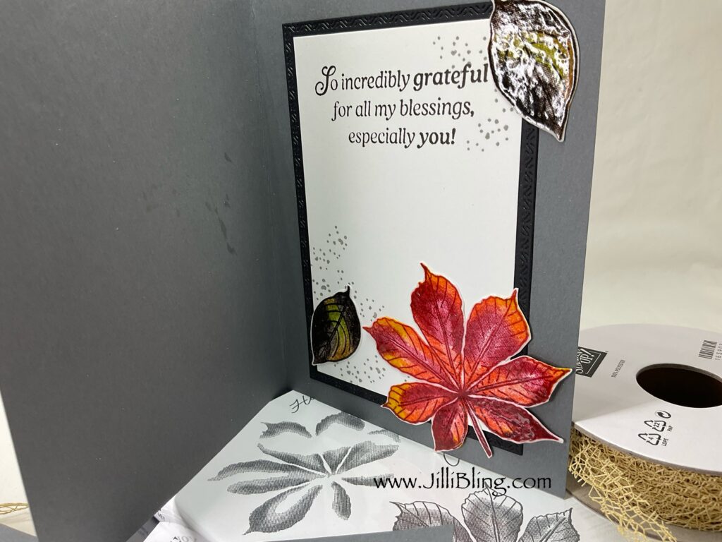 Imagine the possibilities when having LOTS of new products sitting on your desk waiting to be used. Where do you start? First I think looking through each item so you are slightly familiar with what all is there. Next come up with one stamp set and just try. An easier way is to copy a SU sample. Soooo many ideas come from making one copied card! Do you notice how brilliant my stamped leaves look? They are stamped on white with regular ink… BUT I have a secret to make them bright!