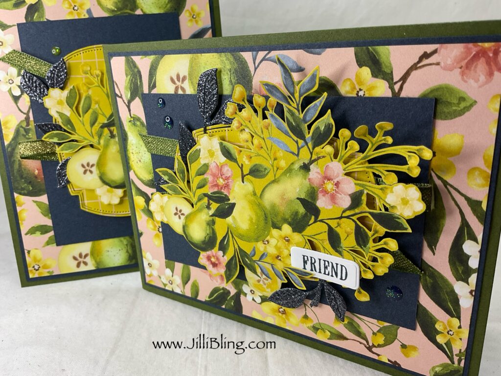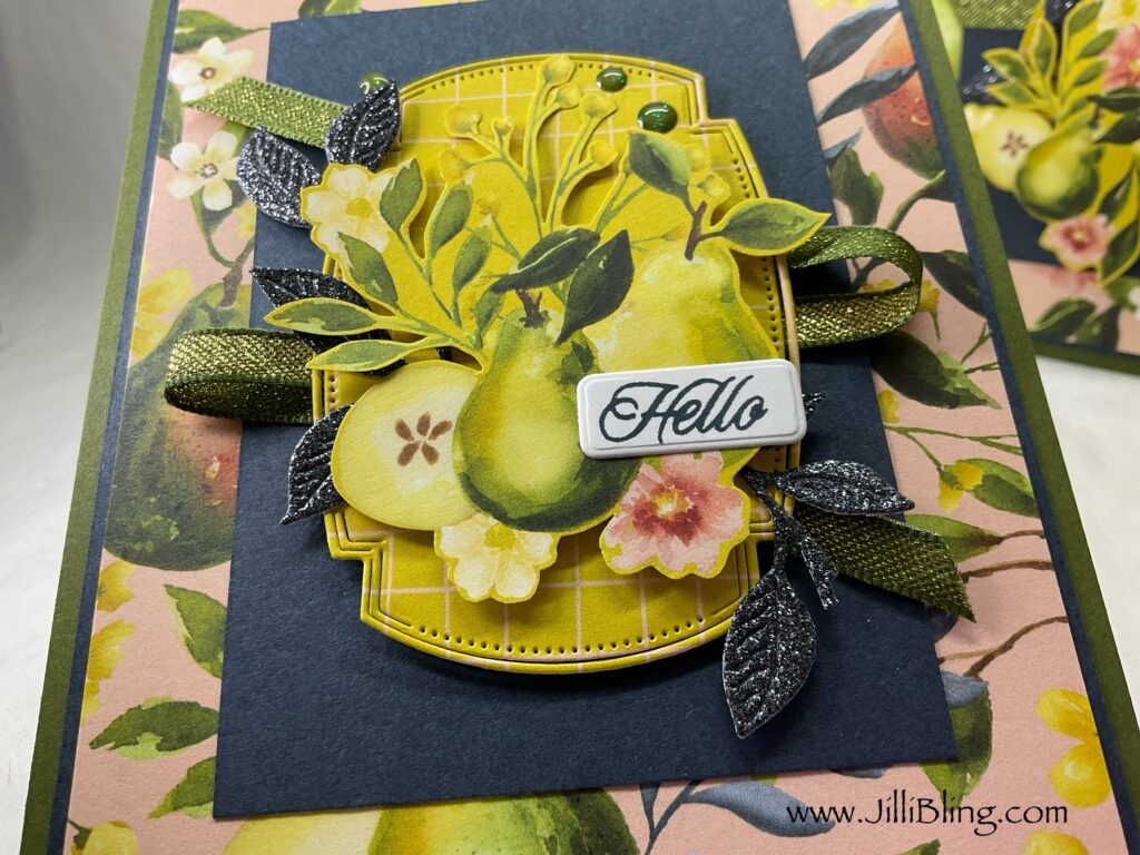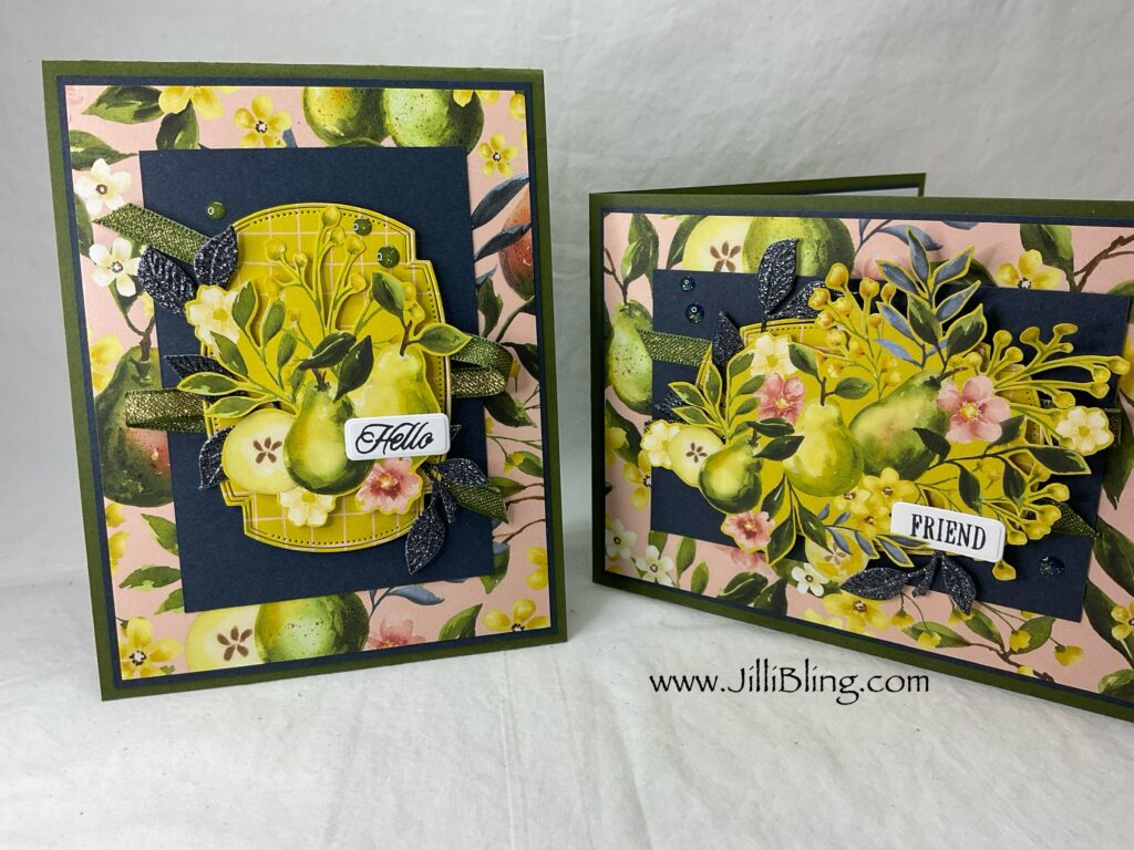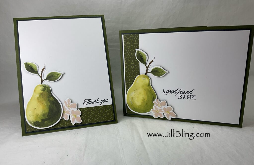 Painterly Pears Product Suite is so very nice! It includes the Perfectly Pears Bundle, beautiful DSP, mossy/gold ribbon and sparkly gems. It’s all so nice I am stumped with where to start. Did you know, the dies cut out the images on at least one page of DSP! The DSP is real rich in color and pattern. The B side of the papers beautifully coordinates with all the sheets… but it becomes a bit busy…. Busy in a beautiful way. So do you choose to cut out images on the DSP or Two Step Stampin or stamp the images and color them with the Blends. Whew! I will make two projects using a few, soon to be released, new products!