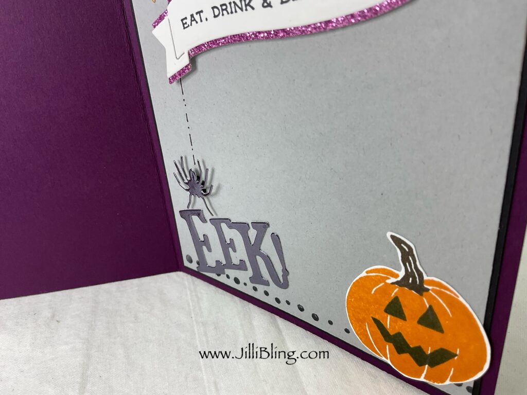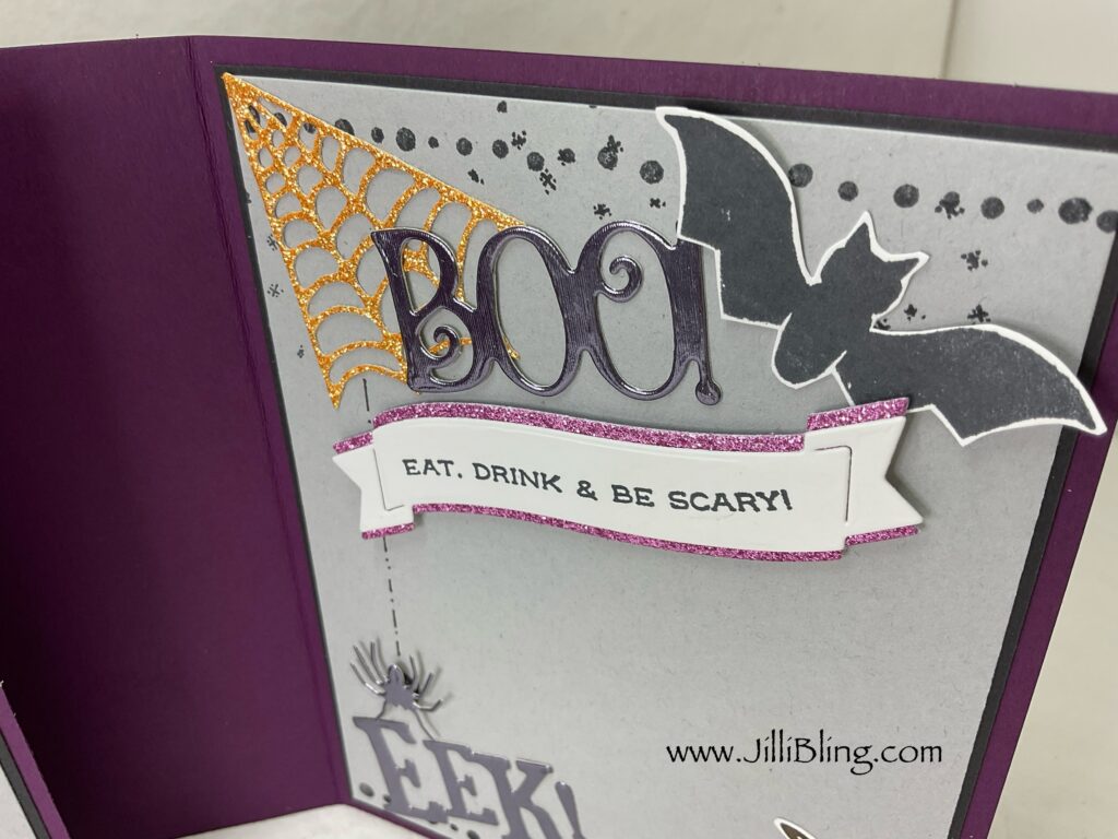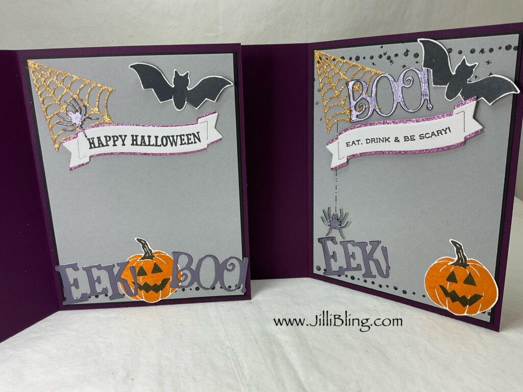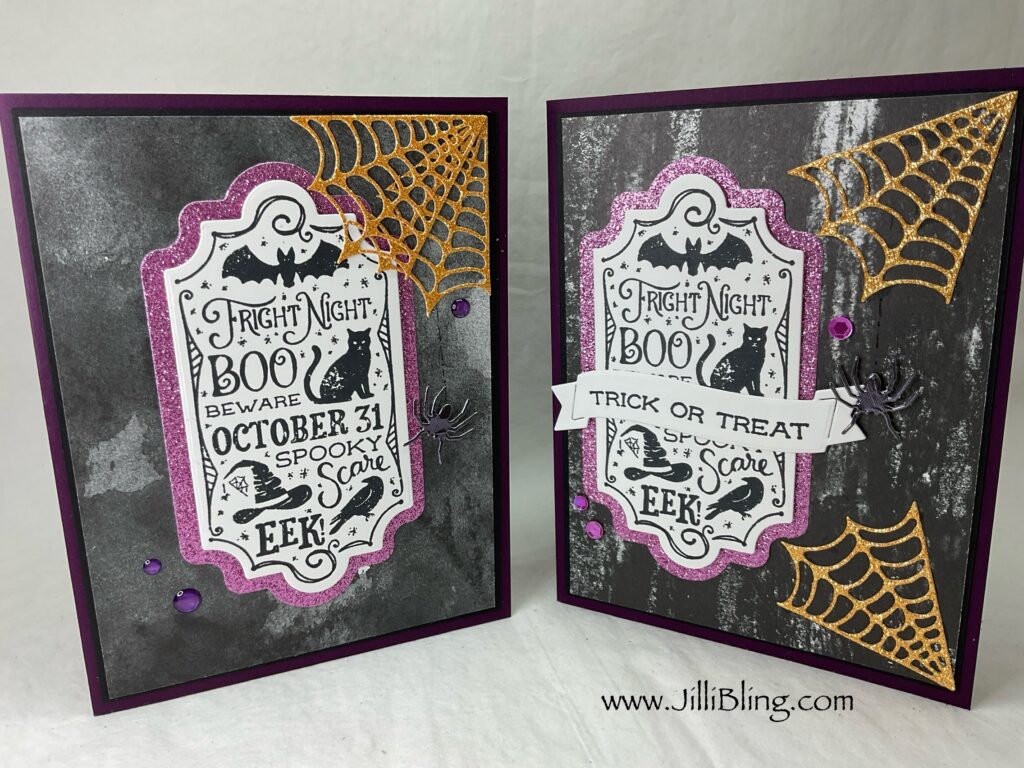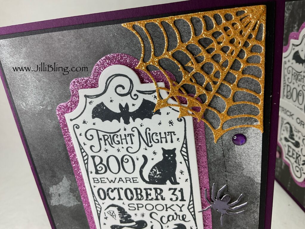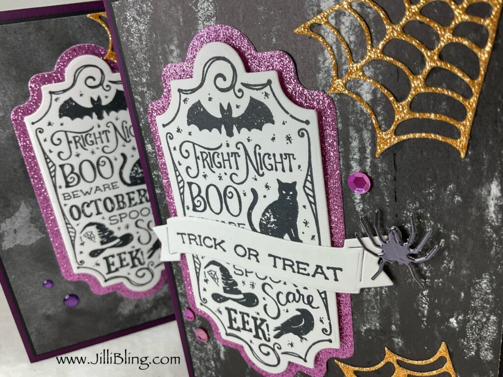 Are you ready for fall? Halloween? This new Fright Night bundle is just perfect in my eyes! I love the primary stamp…. cute Halloween images and words all on one stamp. The dies are even more fun: layering label dies, spider web, spider, BOO and EEK words AND a banner label that perfectly fits three curvy Halloween words. There is also an optional die to make a hole in the top of the focal. What do you think?