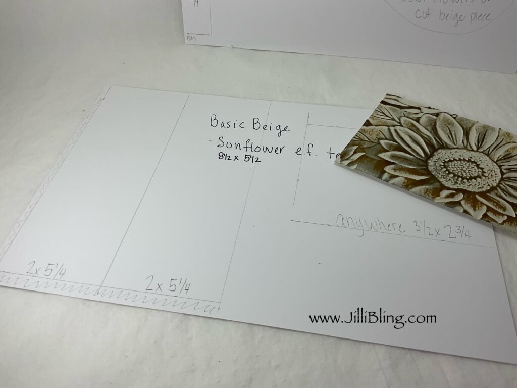 Beige flowers embossed 8 1/2 x 5 1/2, or cut in half for easy mailing. See the video for further cutting directions. You will use three pieces cut to: two 5 1/4 x 2 One 2 3/4 x 3 1/2