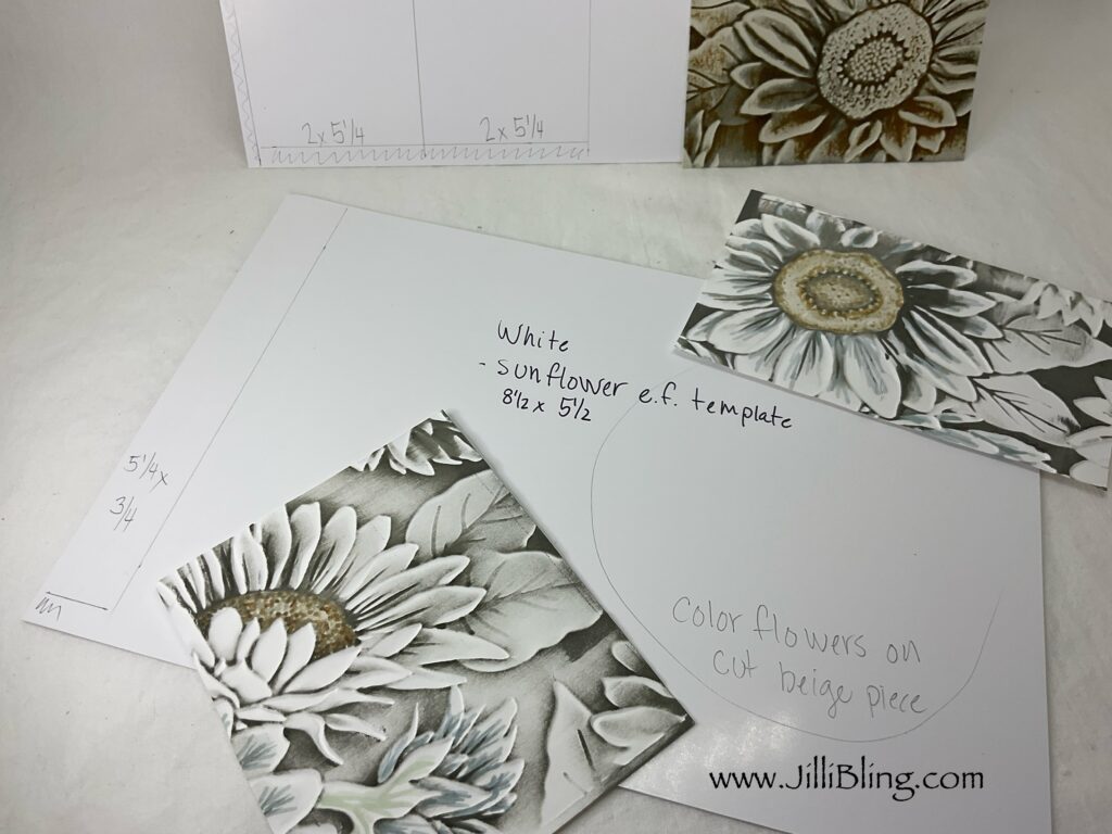 White flowers embossed 8 1/2 x 5 1/2, or cut in half for ease in mailing. See the video for further cutting directions. You will use two pieces cut to: Hand cut wide your favorite flowers matching your focal point panel