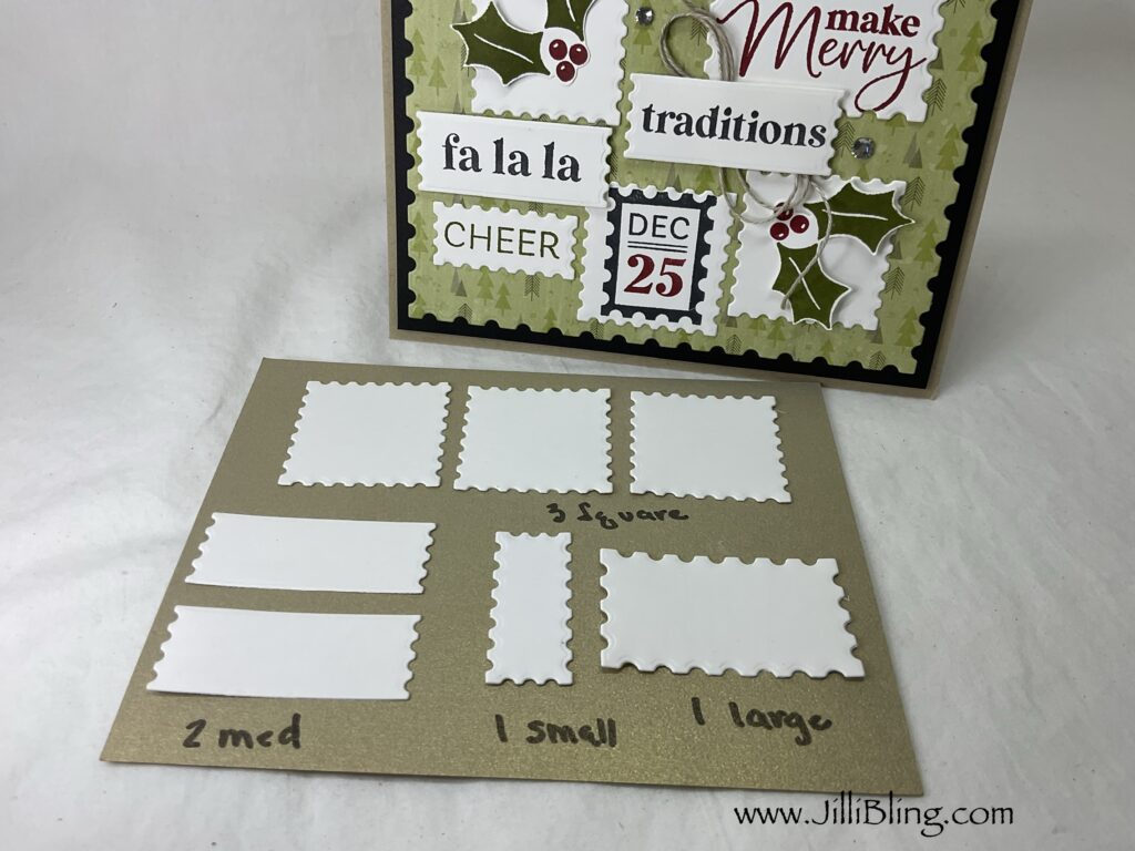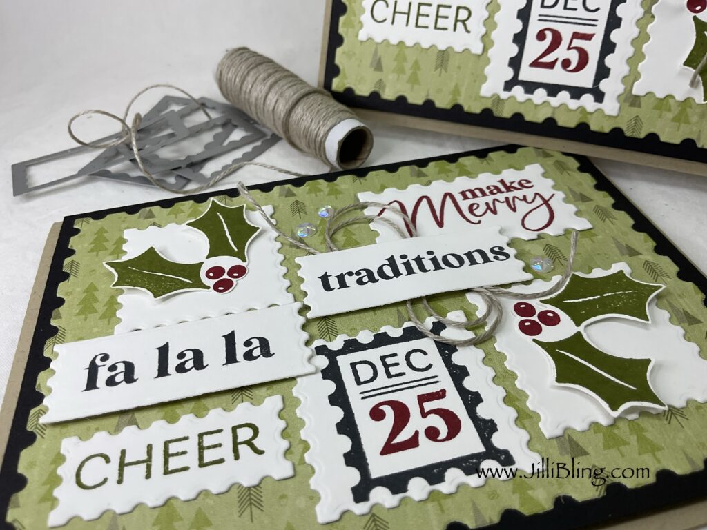 One stamp set and dies = Christmas card magic! I LOVE this card. When you look at the stamp set, what images/stamps do you choose to create your card? They all will work. The perennial postage die set coordinates perfectly. Any DSP with a small pattern will work as a background. What do you think?