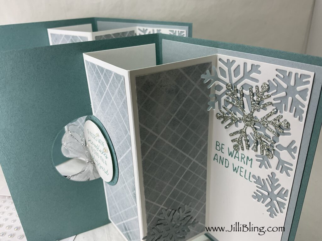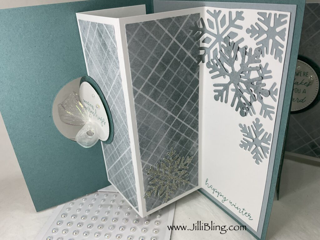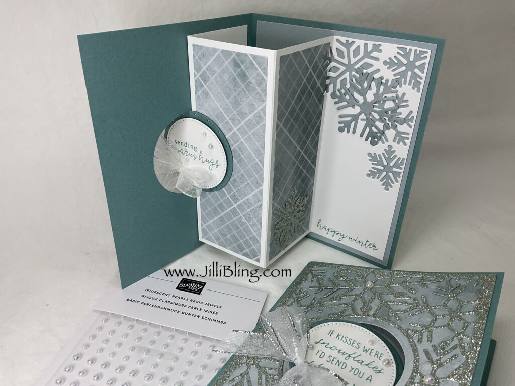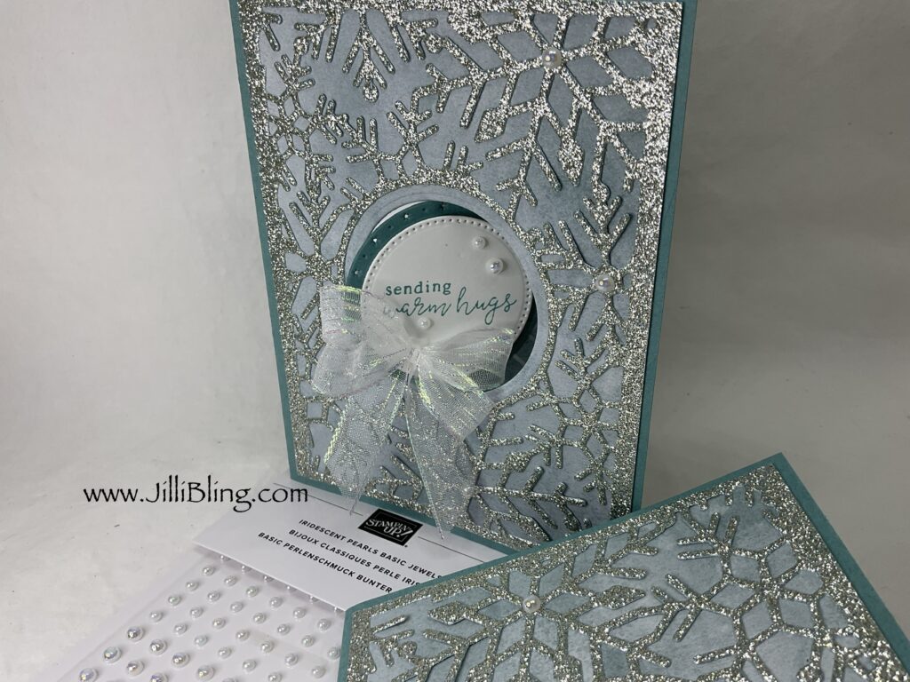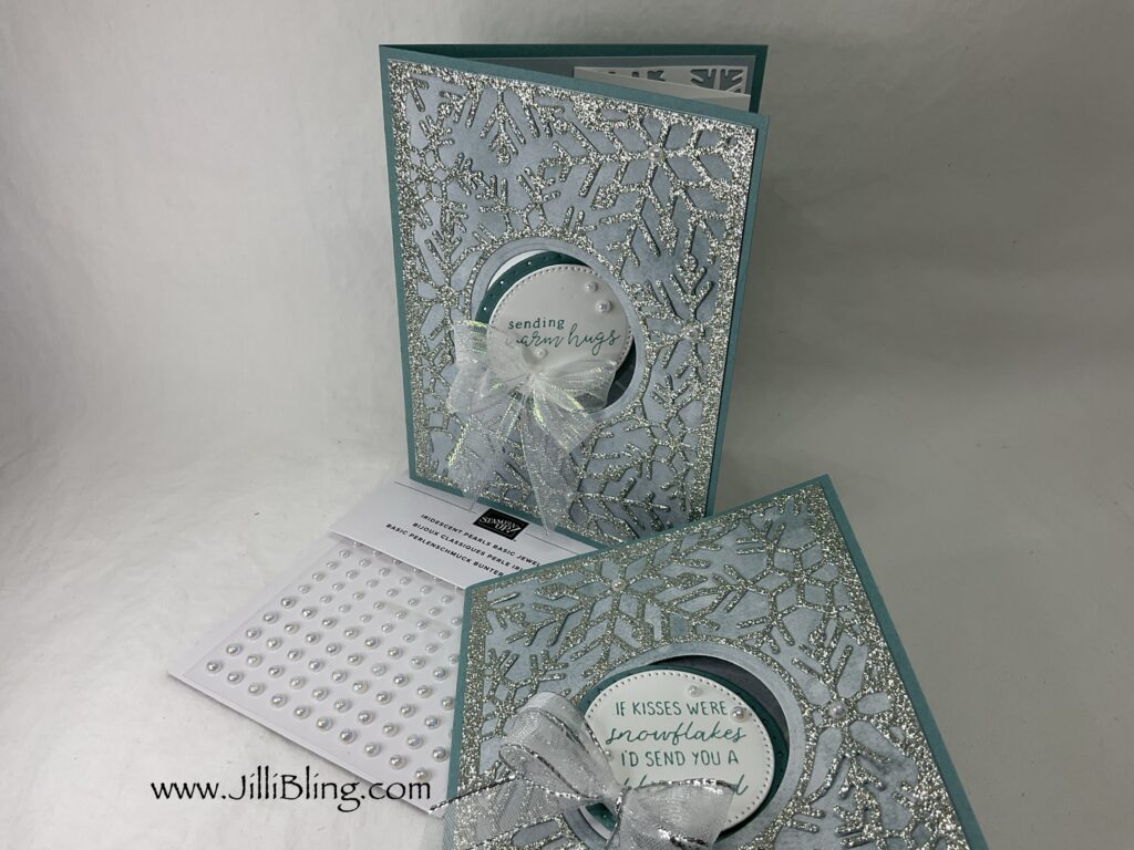Snowflake Kisses Bundle is a good one! All those snowflakes are just delightful. This project calls for glimmer paper and sparkly snow like bling. Did you see that big full card front die? Wow wee! The circle hole right in the center is perfect for one of MANY greetings. There is a slightly smaller circle die, with tiny snowflakes around the perimeter, that perfectly sits inside the big background die. Oh oh oh, there are individual snowflakes too. AND there is a die that fits in the corner (see the video). This is a fun bundle! This project is a bit complex. I suggest watching the video. If you are going to make this card, cut the paper and let’s make the card together. I would love to see photos of your completed card. ❤️❤️❤️