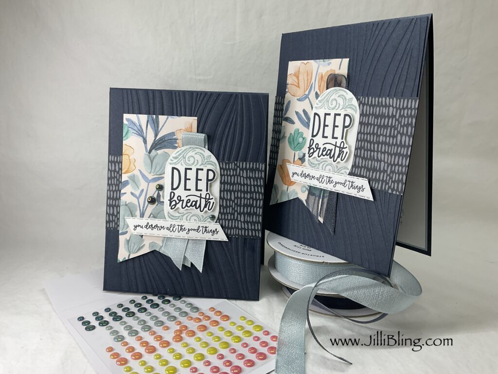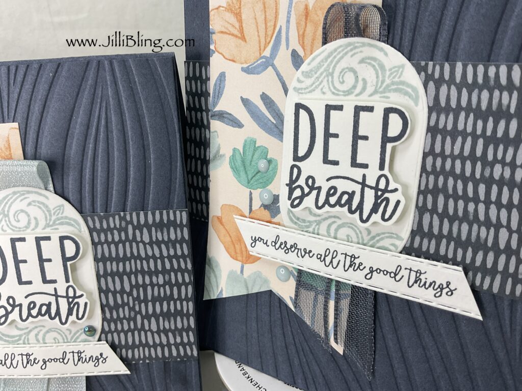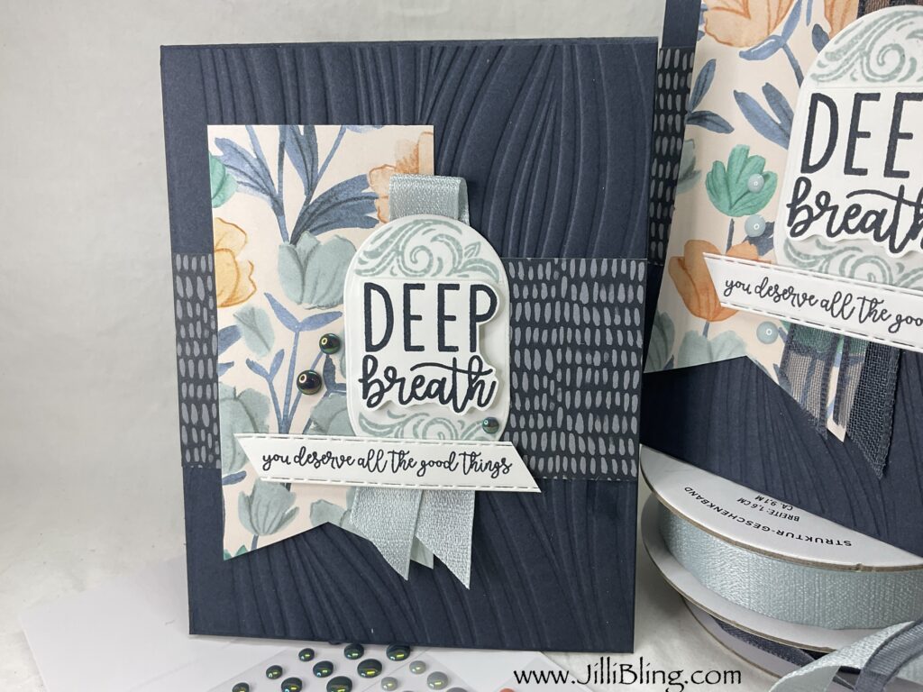 Secret sea deep breath card: Base 4 1/4 x 11 Texture 4 1/8 x 5 3/8 Floral DSP 2 x 4 Sea DSP 2 x 4 Focal 2 x 2 3/4 Sea greeting 1 1/2 x 8 1/2 strip Words die 1 x 5 1/2 In cloud 5 1/4 x 4 In white 5 1/8 x 3 7/8