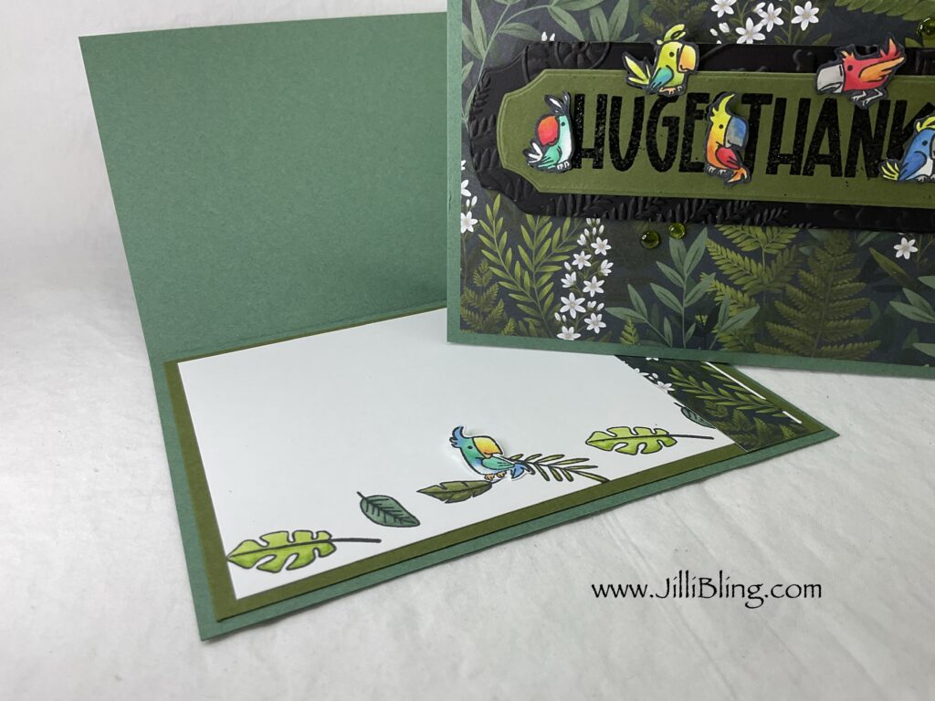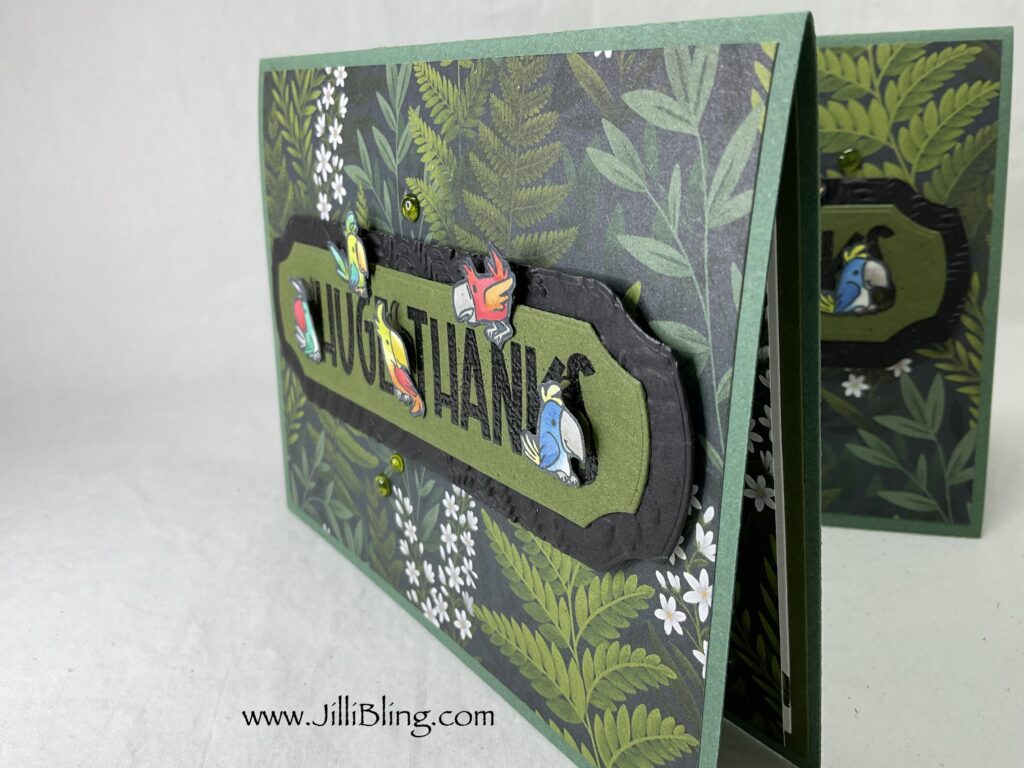 Caring Animals stamp set and Fern & Fauna DSP are an unlikely pair…. But it works! I love this project! Every May I like to send my peeps a stamp set (from the new catalog) and card to say Thank You for being a stampin Up team member. This stamp set has three large greetings surrounded by adorable animals. There are four leaves in the set that are perfect for embellishment. What do you think?